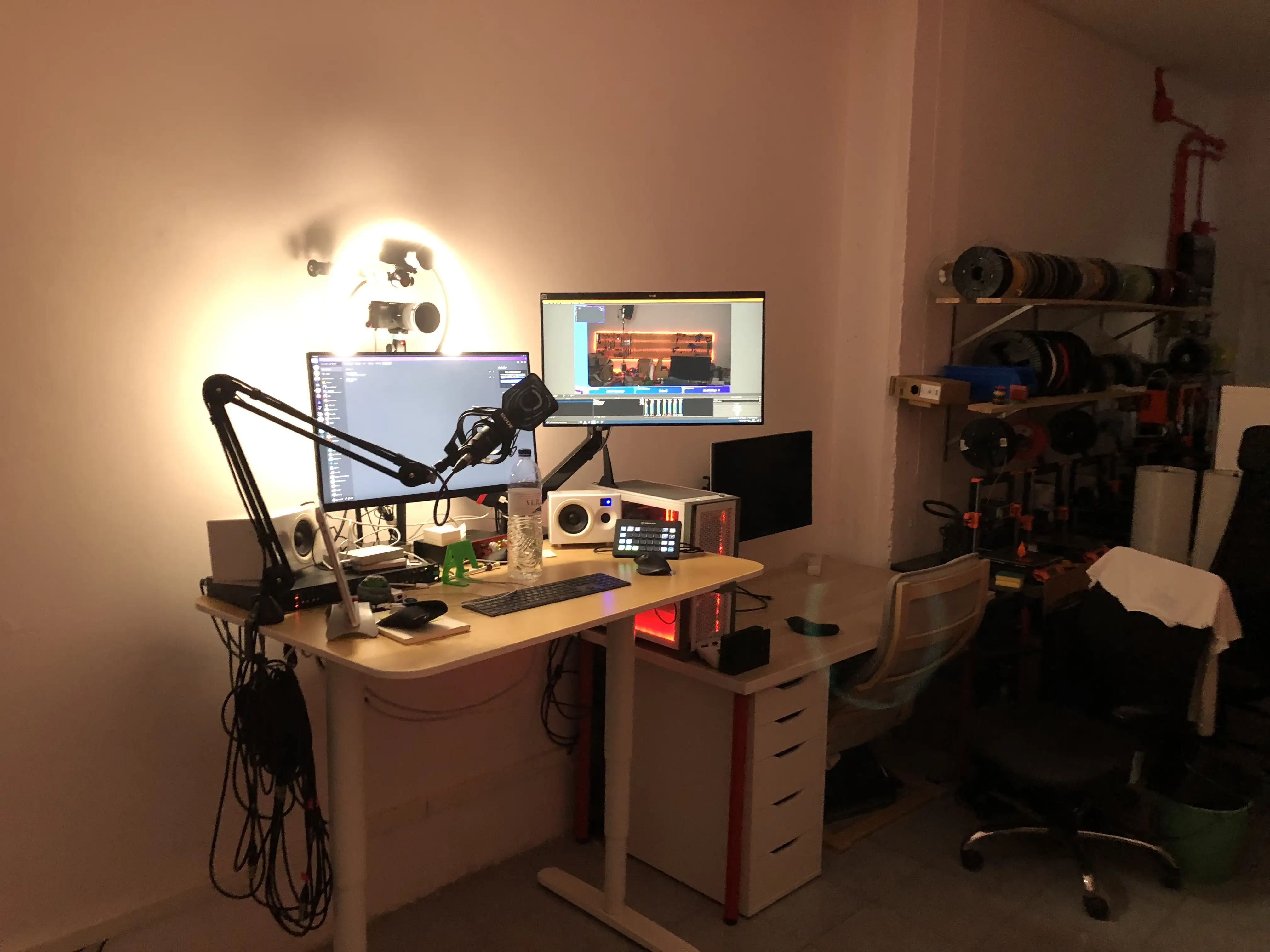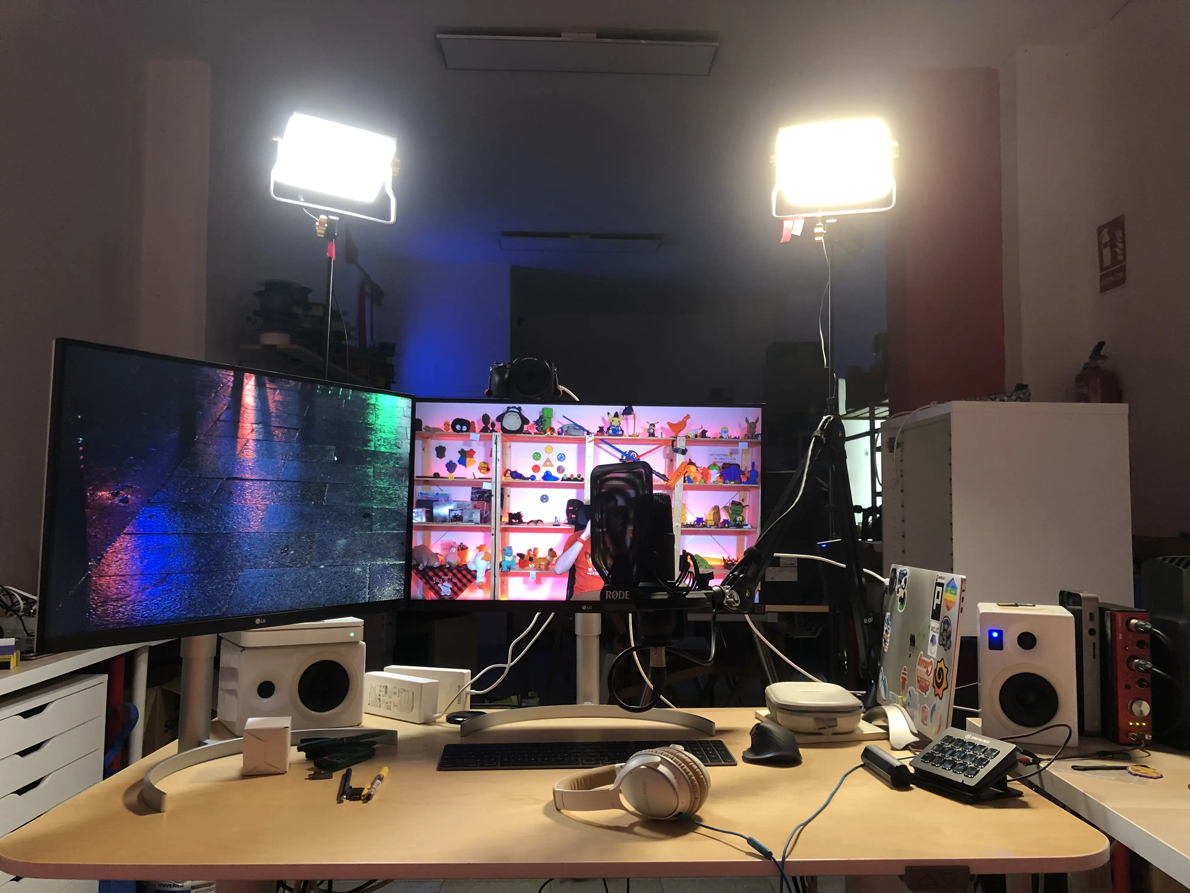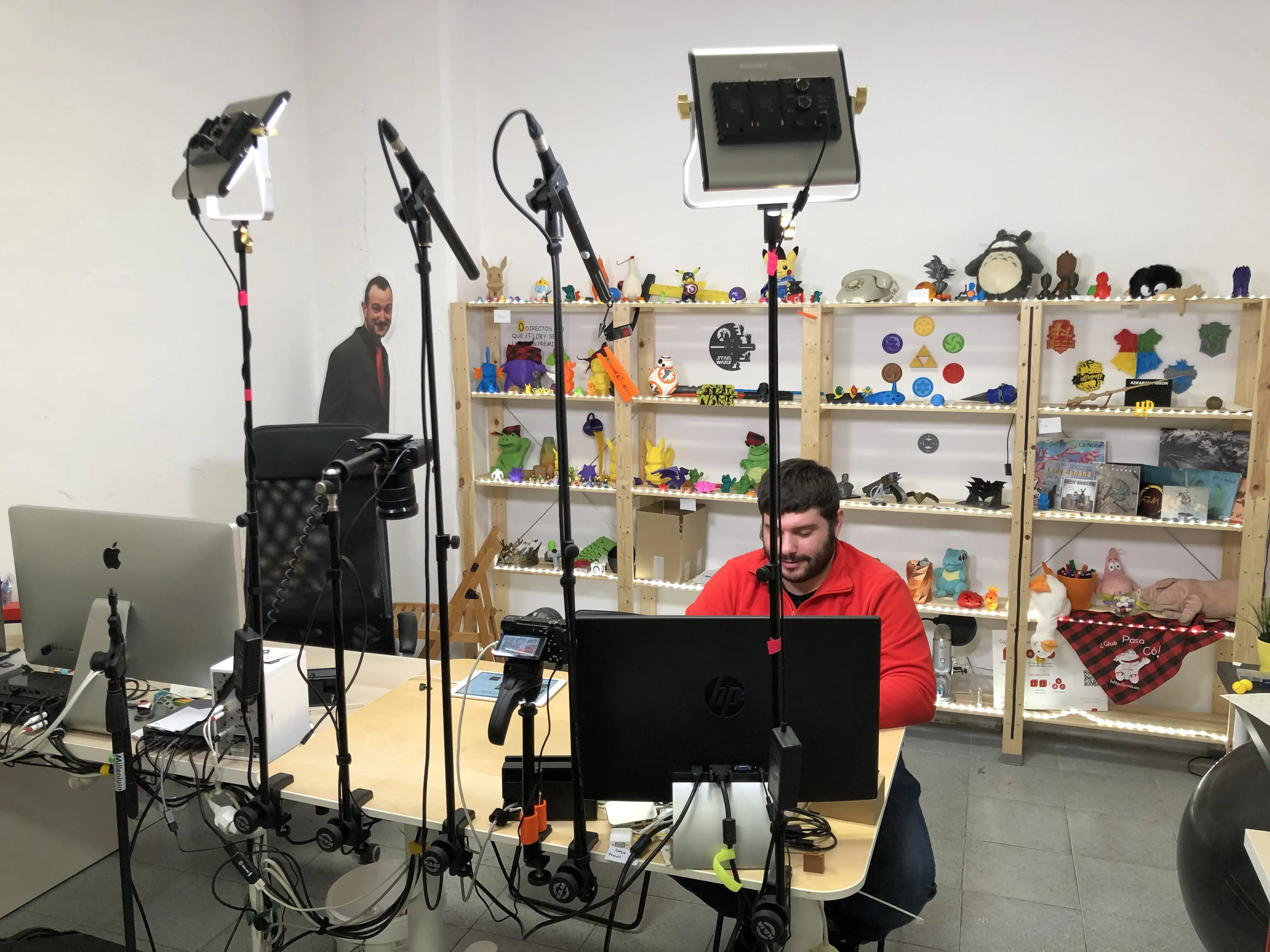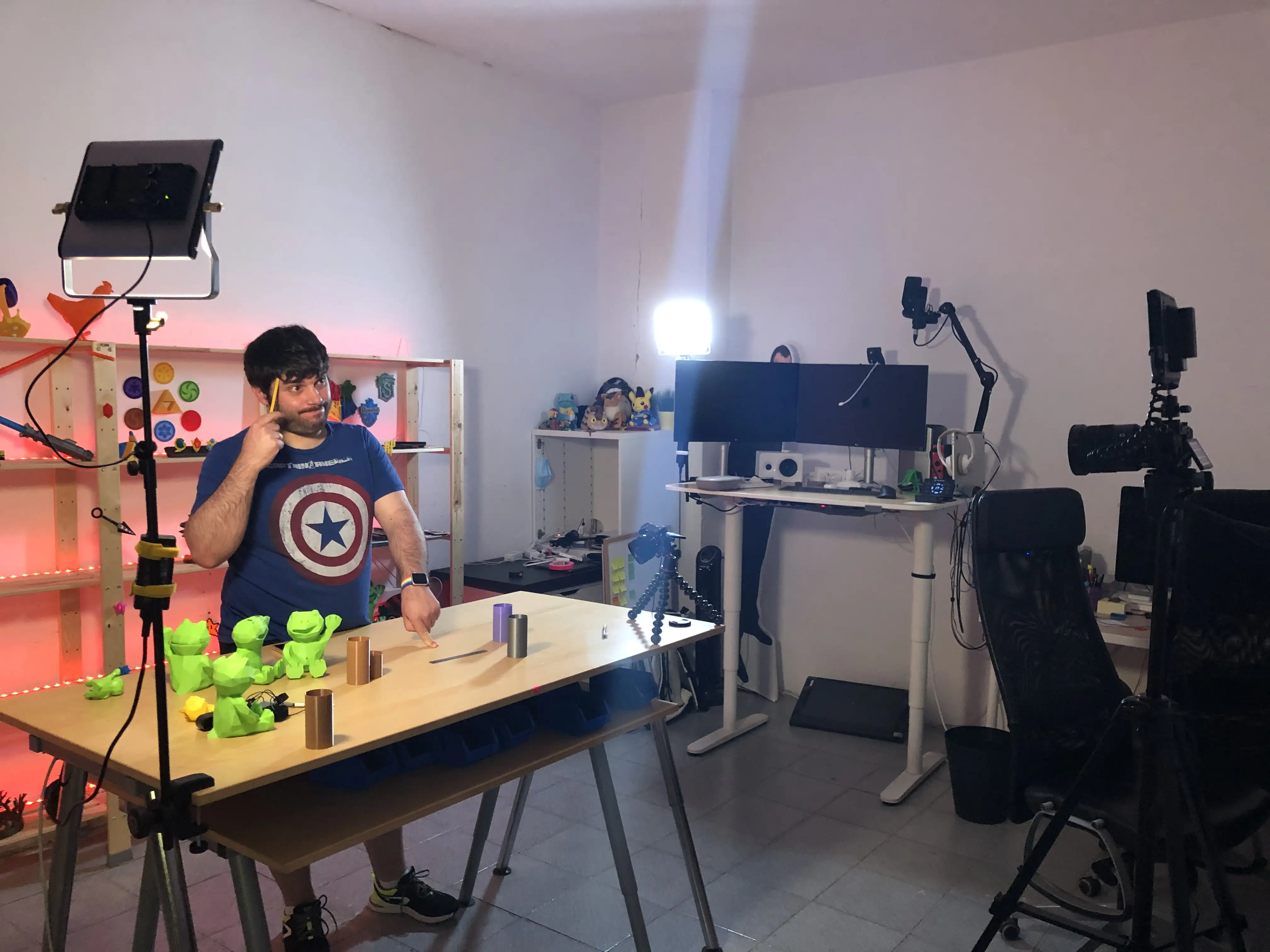 Pronto me hice con una mesa elevable y moví mi setup para tener la zona de herramientas al fondo. De esta manera con las mismas cámaras podía hacer directos personales, y grabar vídeos con el decorado bonito.