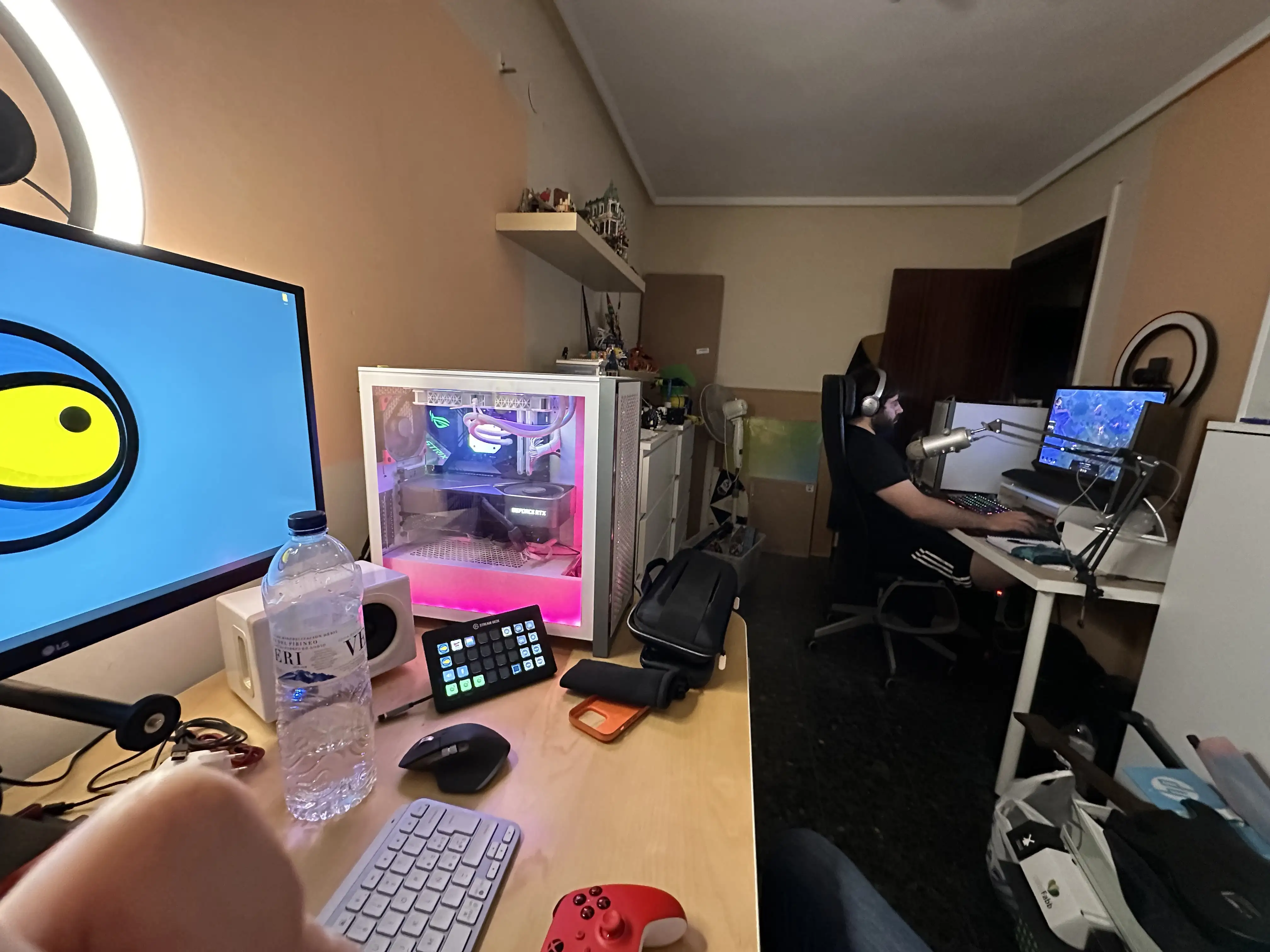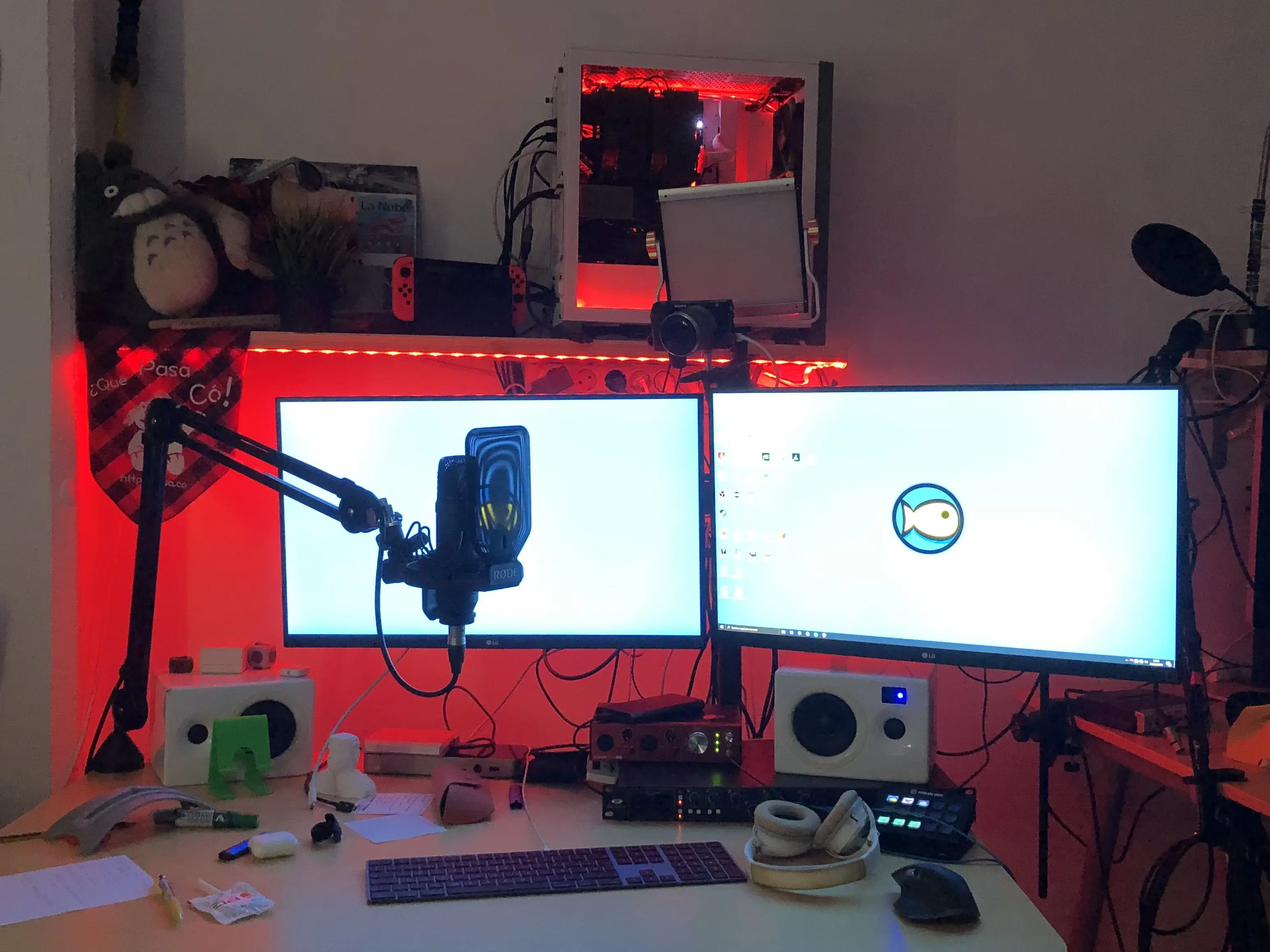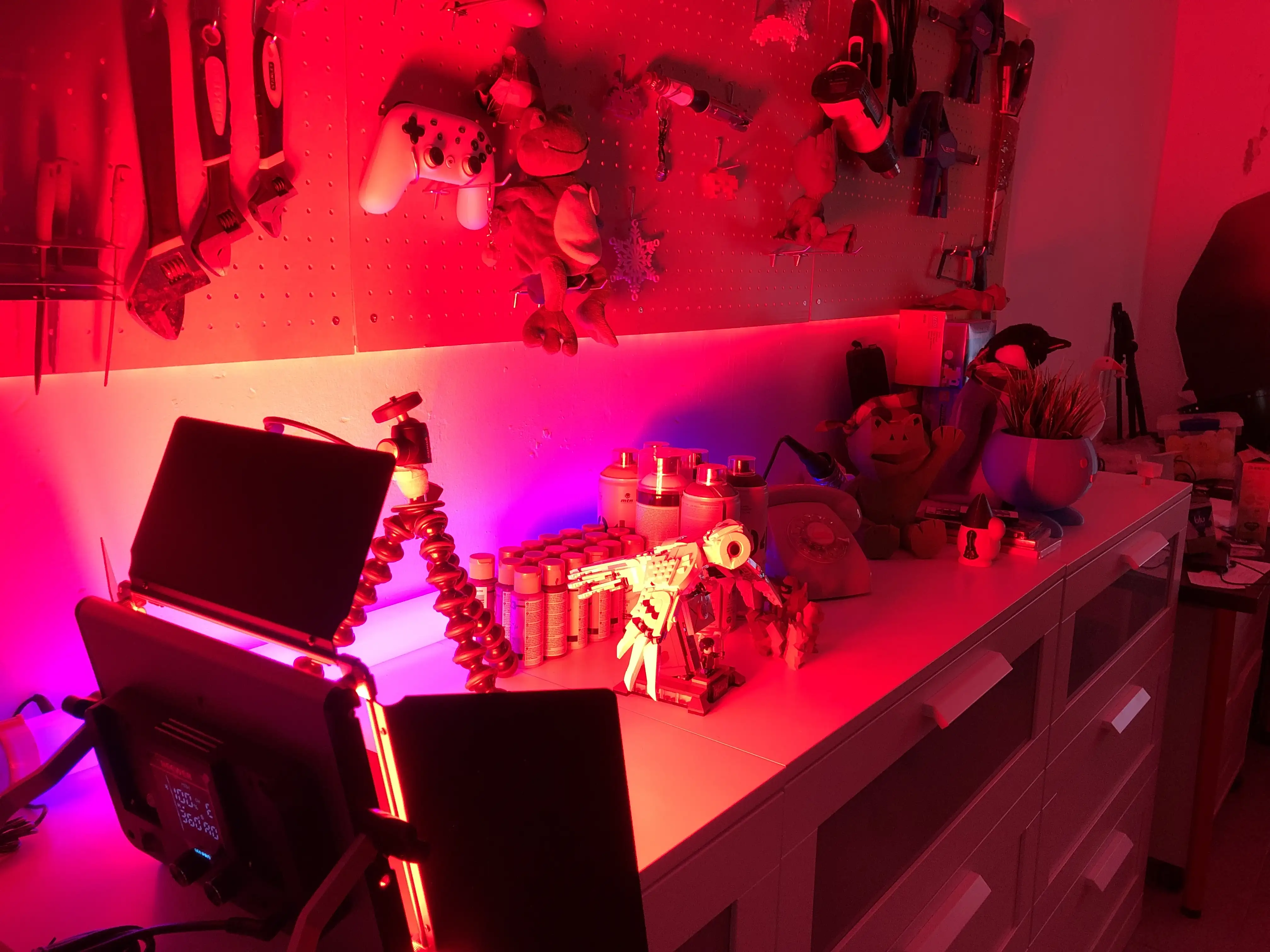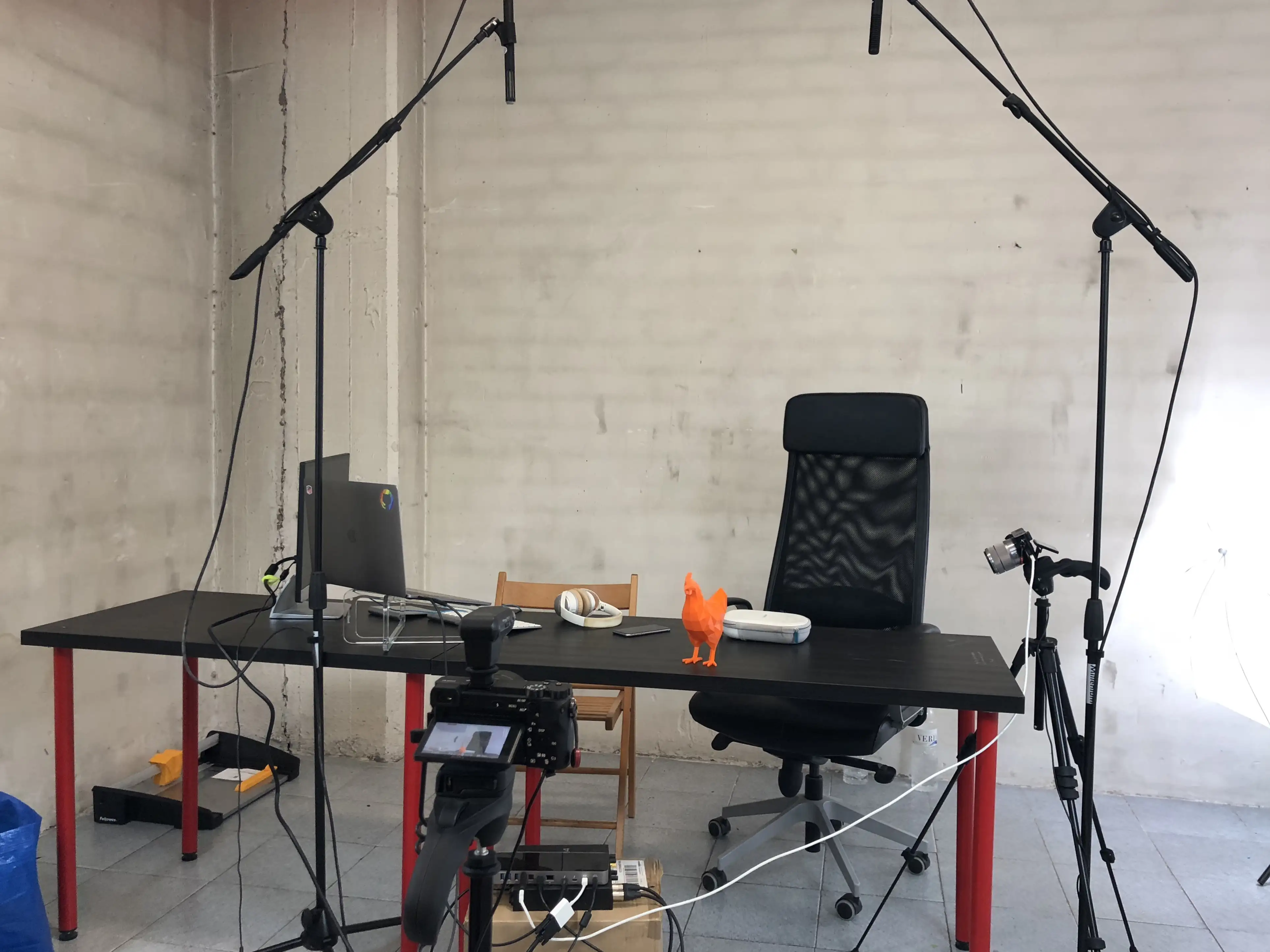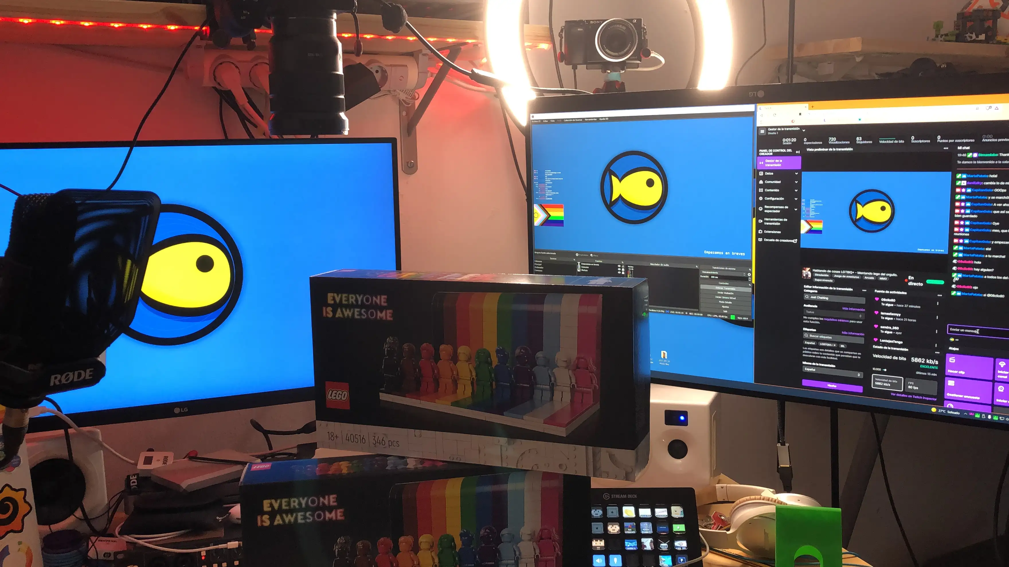Pronto me hice con una mesa elevable y moví mi setup para tener la zona de herramientas al fondo. De esta manera con las mismas cámaras podía hacer directos personales, y grabar vídeos con el decorado bonito.