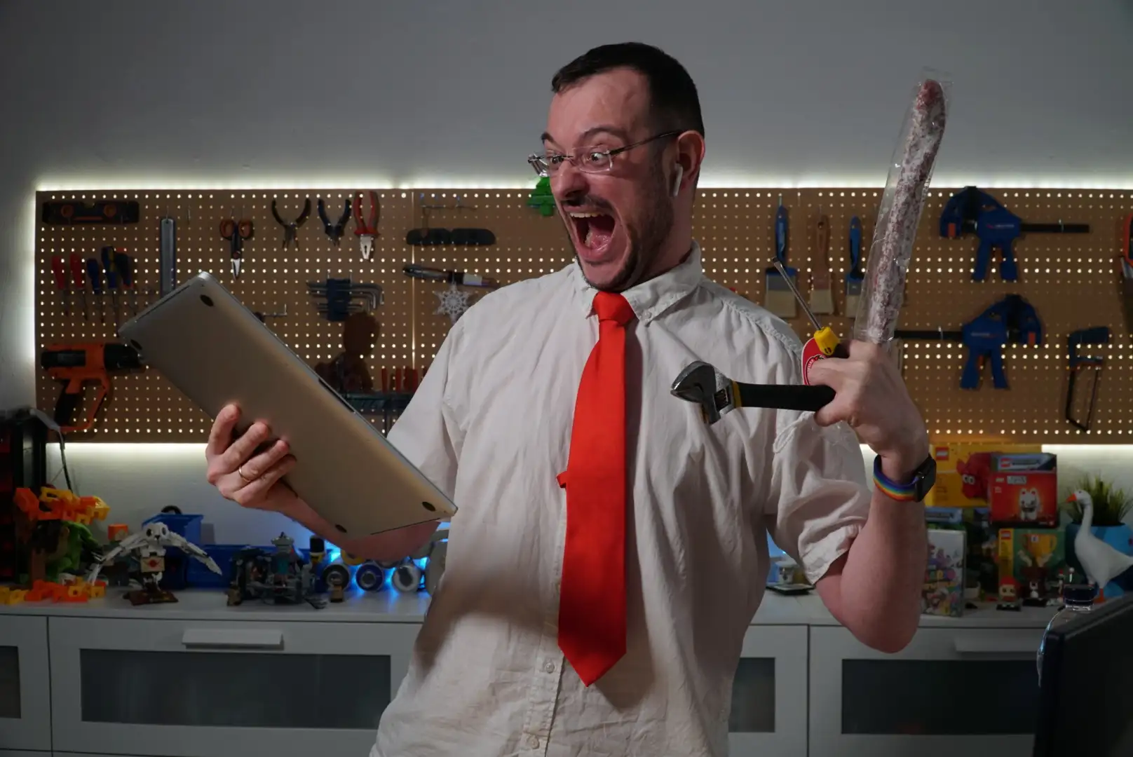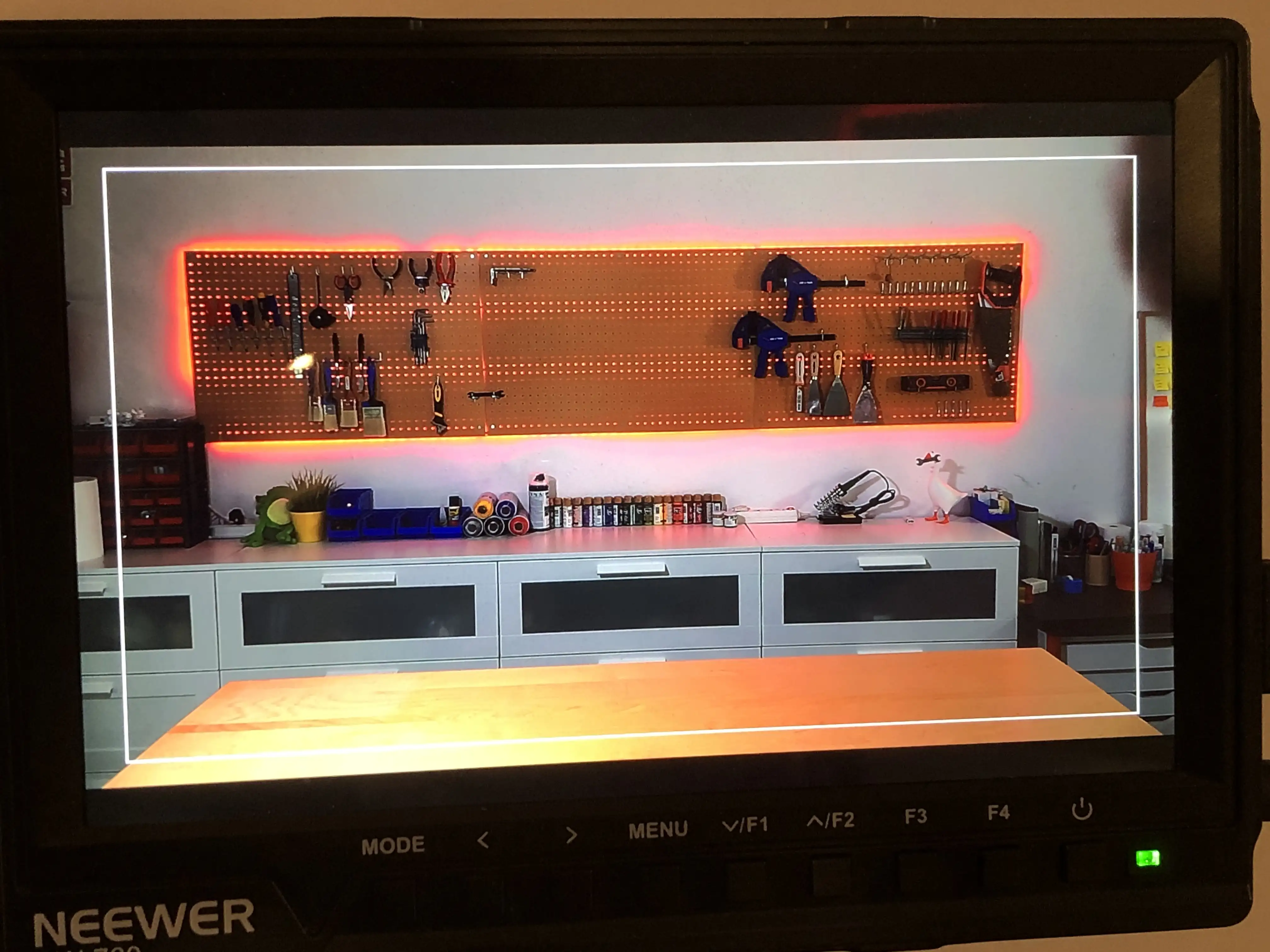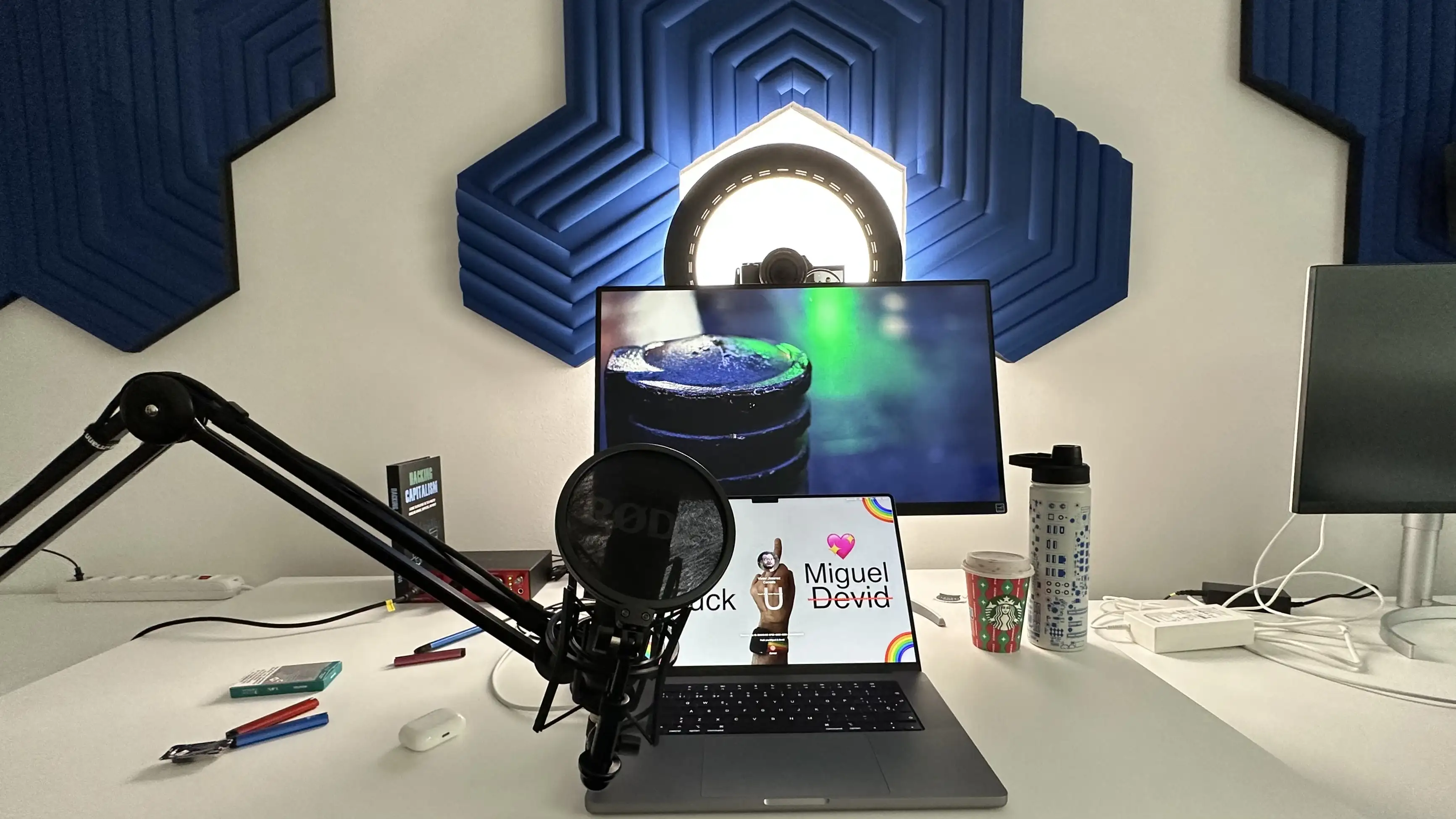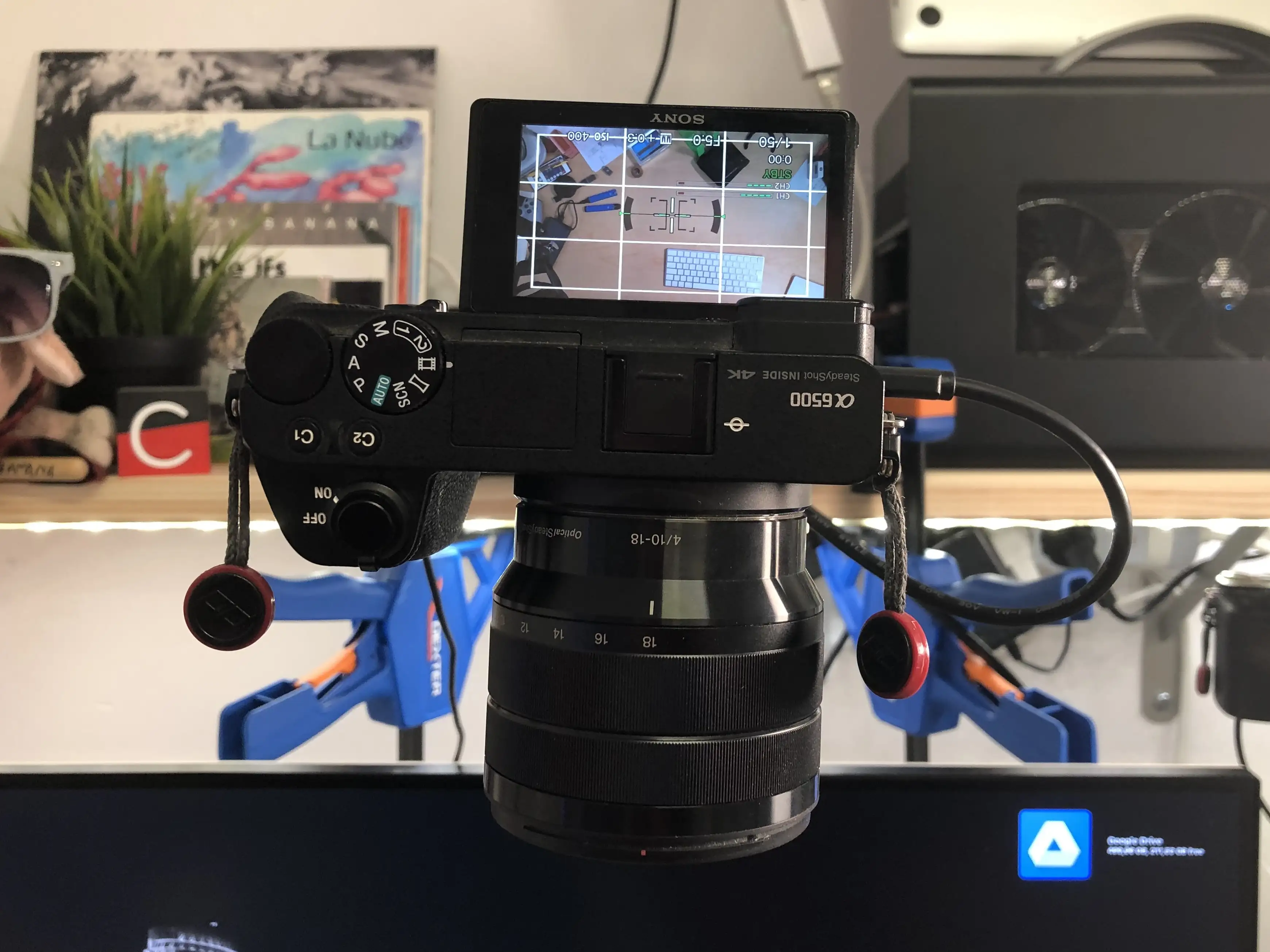 Pronto me hice con una mesa elevable y moví mi setup para tener la zona de herramientas al fondo. De esta manera con las mismas cámaras podía hacer directos personales, y grabar vídeos con el decorado bonito.