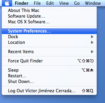 Lo primero va a ser abrir las preferencias del Lenguaje e Idioma. Podemos acceder a las Preferencias del Sistema desde la barra de menú, arriba, pulsando en la manzana. Se despliega un menú en el que elegimos "System Preferences …".