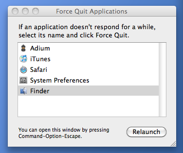 Se muestra una ventana con el listado de las aplicaciones abiertas. Selecciona Finder y pulsa Relaunch.