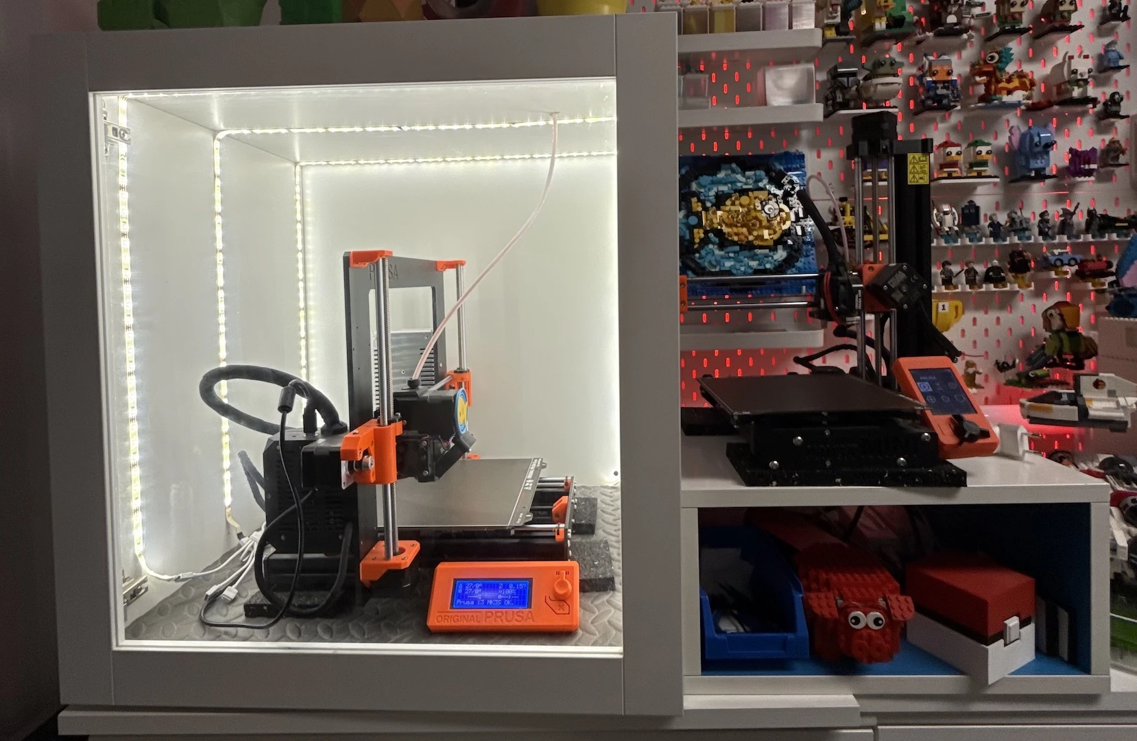 - Prusa MK3S+ Enclosure (350 ~ 730€): Un cerramiento que mantiene el calor durante la impresión y facilita imprimir con materiales avanzados como Policarbonato, Nylon y ASA. También reduce el ruido de la impresora y permite añadir accesorios como iluminación LED.